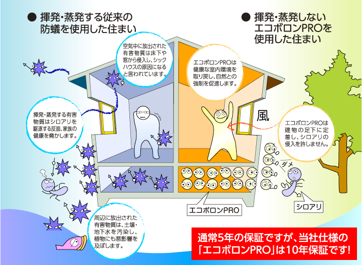 安全で強力、長持ちする防蟻防腐塗料『エコパウダーBX』の特徴「シックハウス」への関心の高まりから生まれた天然素材を原料とする防蟻防腐塗料です。 ![]() |